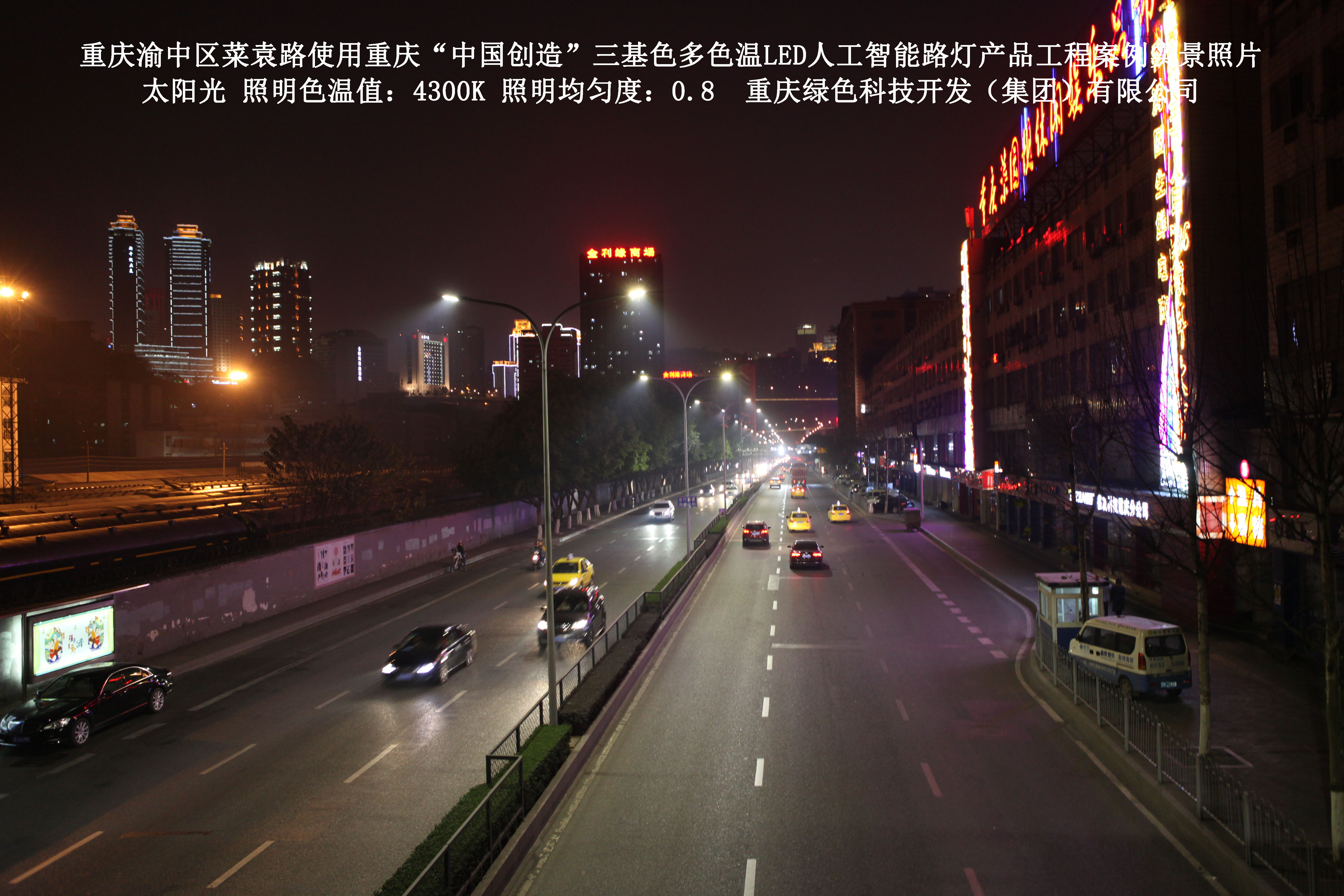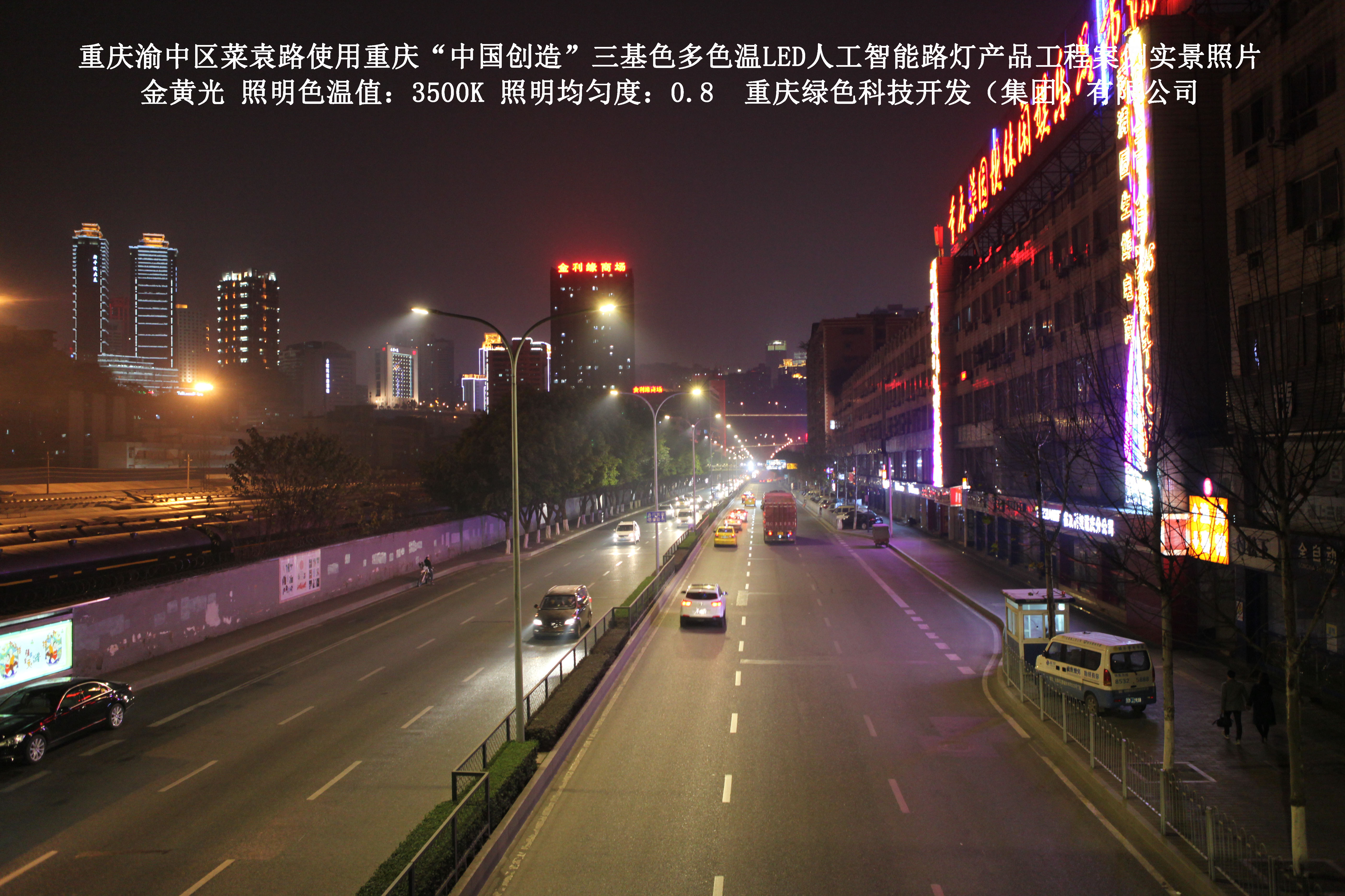 2013年10月,重慶市城市照明管理局使用了我司研發(fā)制造的重慶“中國(guó)創(chuàng)造”三基色多色溫LED人工智能路燈,對(duì)渝中區(qū)菜袁路實(shí)施了綠色照明科技節(jié)能改造工程,該工程已全面竣工。工程實(shí)施后,極大地提高了城市照明清晰度、燈光均勻度、舒適度。通過(guò)智能終端實(shí)現(xiàn)單燈感知、線纜防盜報(bào)警,與原高壓鈉燈相比,節(jié)能率60%以上,有效解決了關(guān)閉控制回路或間隔關(guān)燈方式造成的照明暗區(qū),確保行人和車輛通行的安全,實(shí)現(xiàn)城市路燈照明系統(tǒng)的智能化管理,推進(jìn)了智慧城市建設(shè)。
